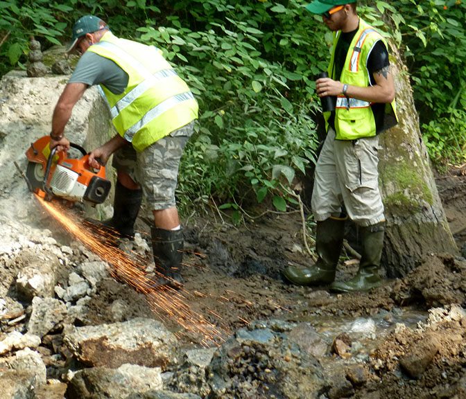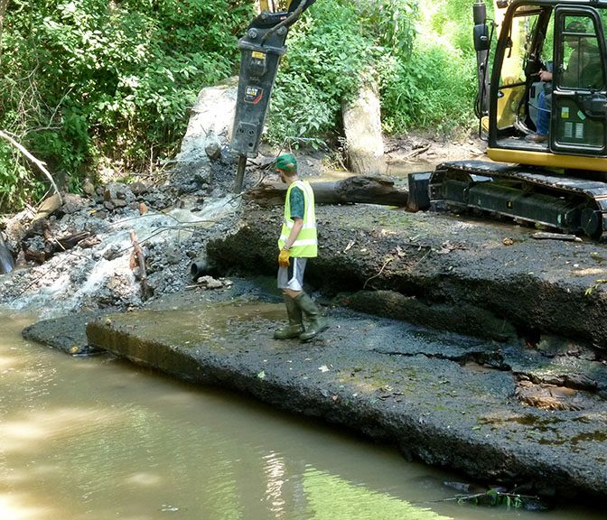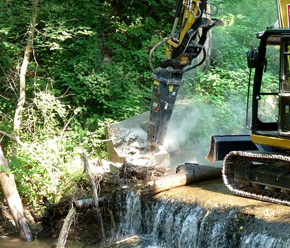 The dam itself had deteriorated badly and as a result there was extensive exposed rebar. The ledge had begun collapsing and there were large holes in it. Downstream, there was unsightly concrete rubble in the streambed. Removal of the dam and disposal of the rebar off-site has eliminated the hazards and restored the stream to natural, free flowing conditions.
