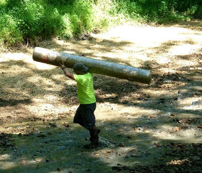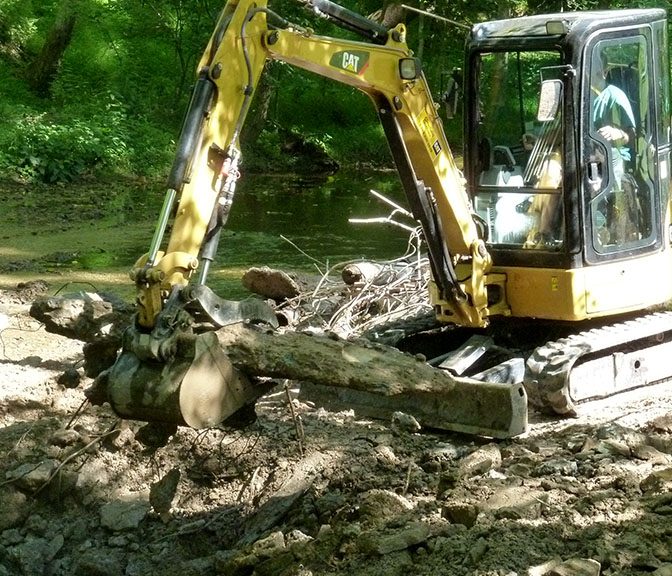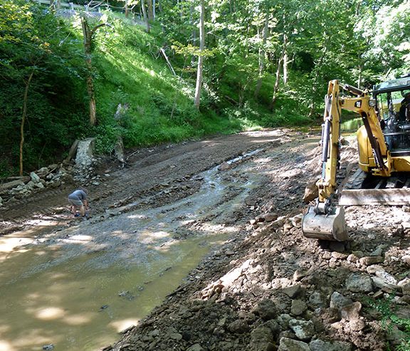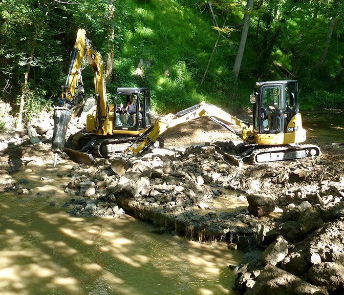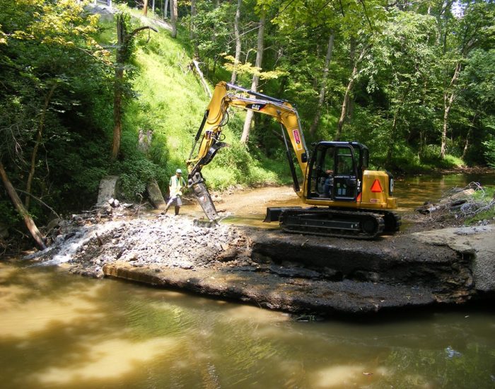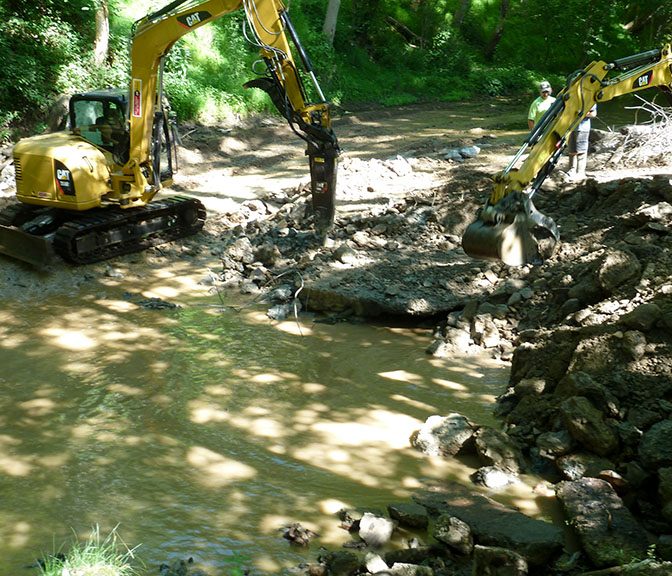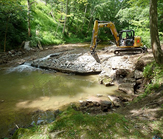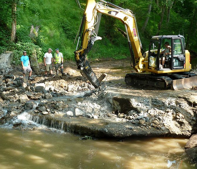 When the dam was in place, it deflected the stream flow toward the stream banks causing erosion. Erosion of the banks compromised the stability of Little Sewickley Creek Road and the private road on the opposite bank. Removal of the dam now allows the water to flow in the middle of the streambed. In addition, grade control structures will be installed in the stream to further reduce stream bank erosion. These structures will mimic those that occur naturally and will also enhance the habitat for fish and macro-invertebrates in the stream.