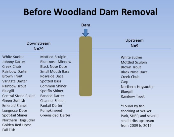 The Woodland Damn was removed in July 2015. The Fern Hollow Nature Center and the QV Creekers have been monitoring and studying the increased biodiversity of the fish population since the removal under the guidance of Eric Chapman (Director of Aquatic Science) of the Western PA Conservancy. Please click through the slide show to see the positive impact removing the damn has brought to the stream.